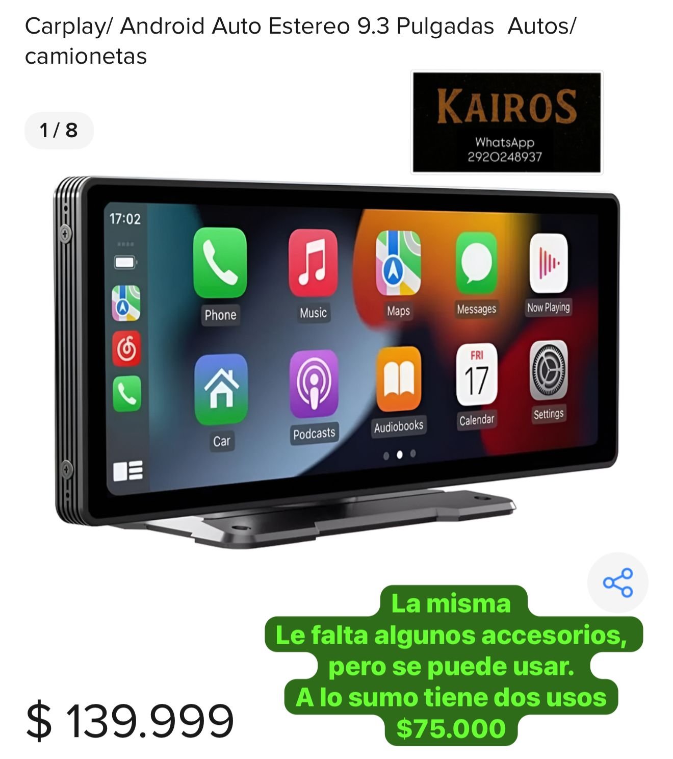 Estéreo inteligente con pantalla táctil de 9.3 pulgadas, compatible con CarPlay y Android Auto, ideal para autos y camionetas.