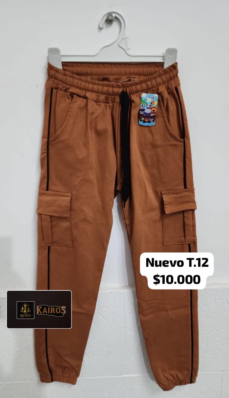 Pantalón tipo cargo color marrón claro, con bolsillos laterales y elástico en cintura.